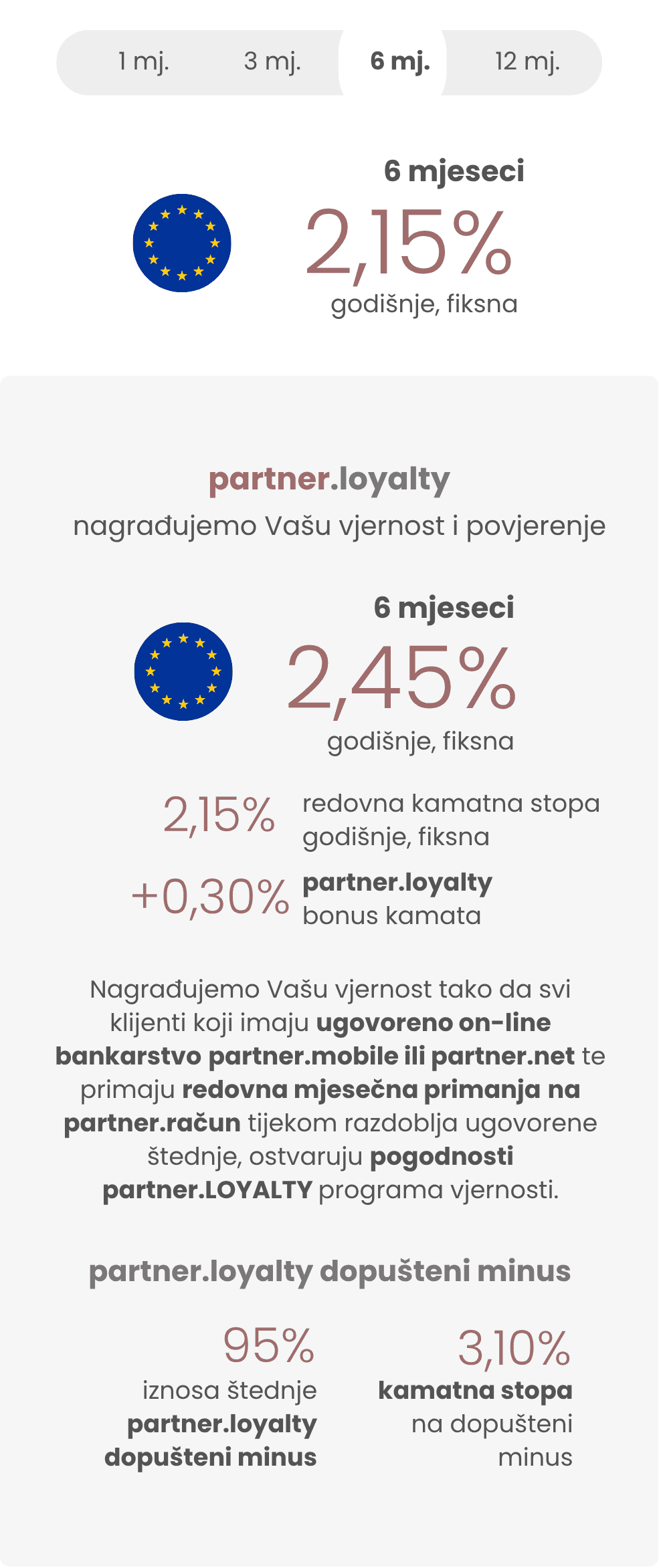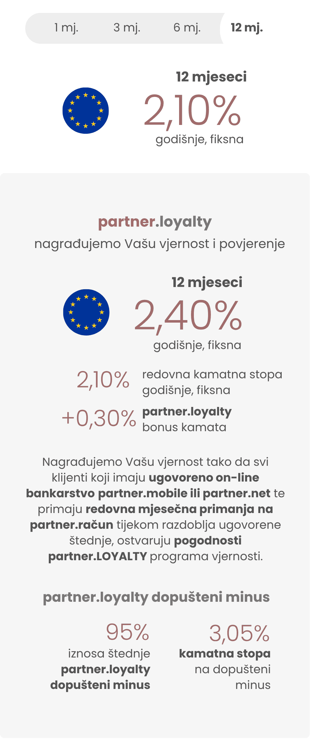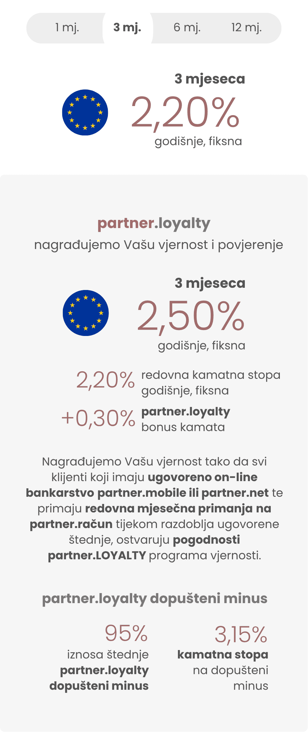 Štednja je dodatno stimulativna za partner.LOYALTY klijente kod kojih nagrađujemo lojalnost kroz bonus dodatak na redovnu kamatnu stopu od +0,30 postotnih poena.