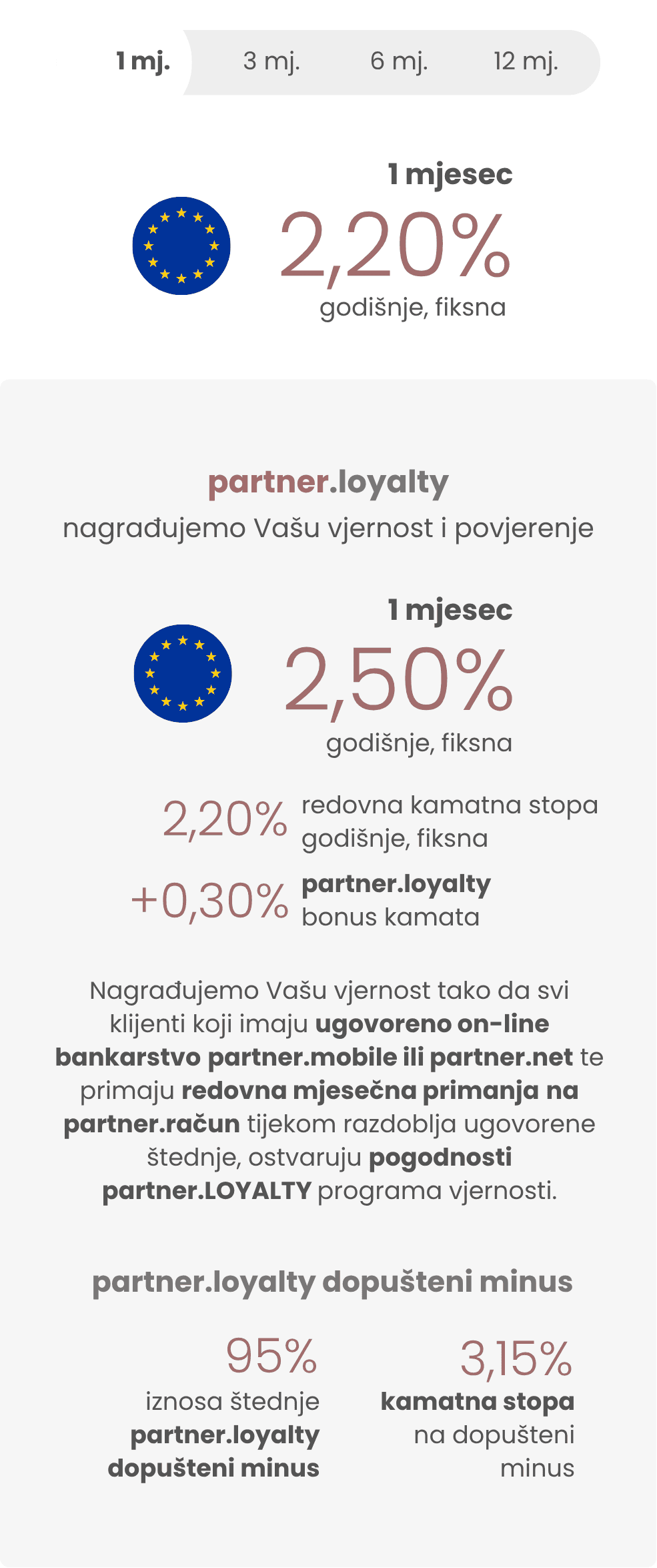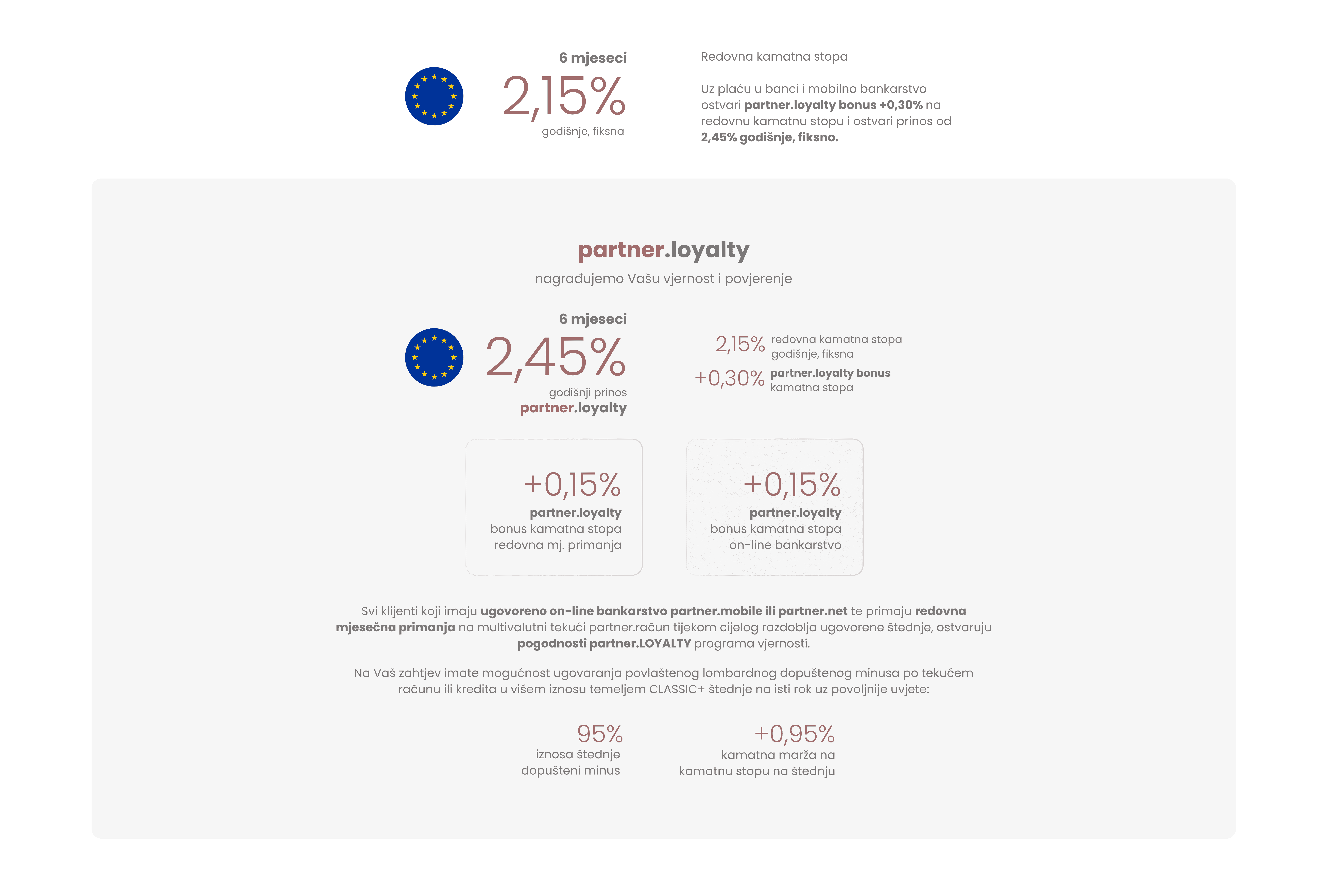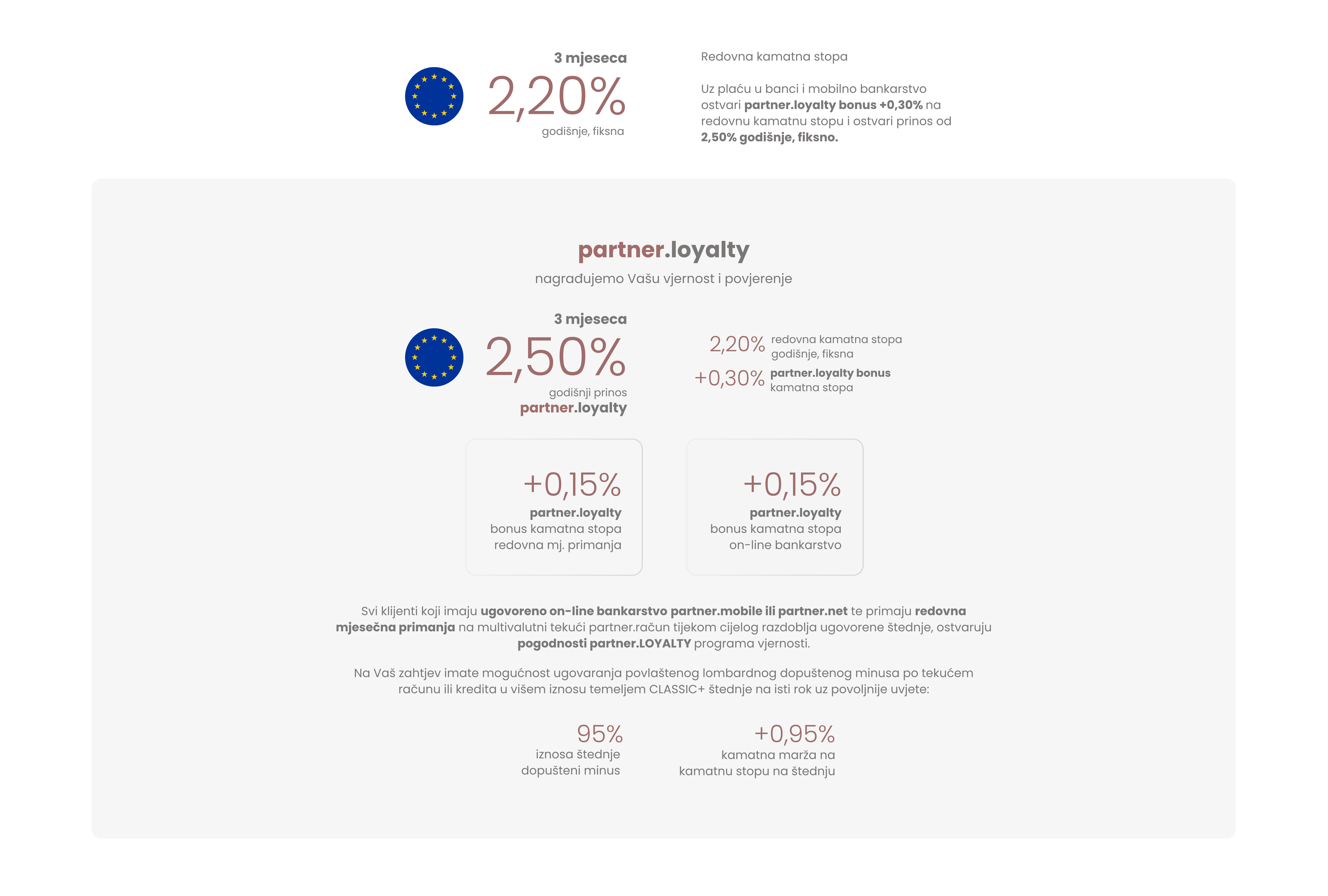 Štednja je dodatno stimulativna za partner.LOYALTY klijente kod kojih nagrađujemo lojalnost kroz bonus dodatak na redovnu kamatnu stopu od +0,30 postotnih poena.
