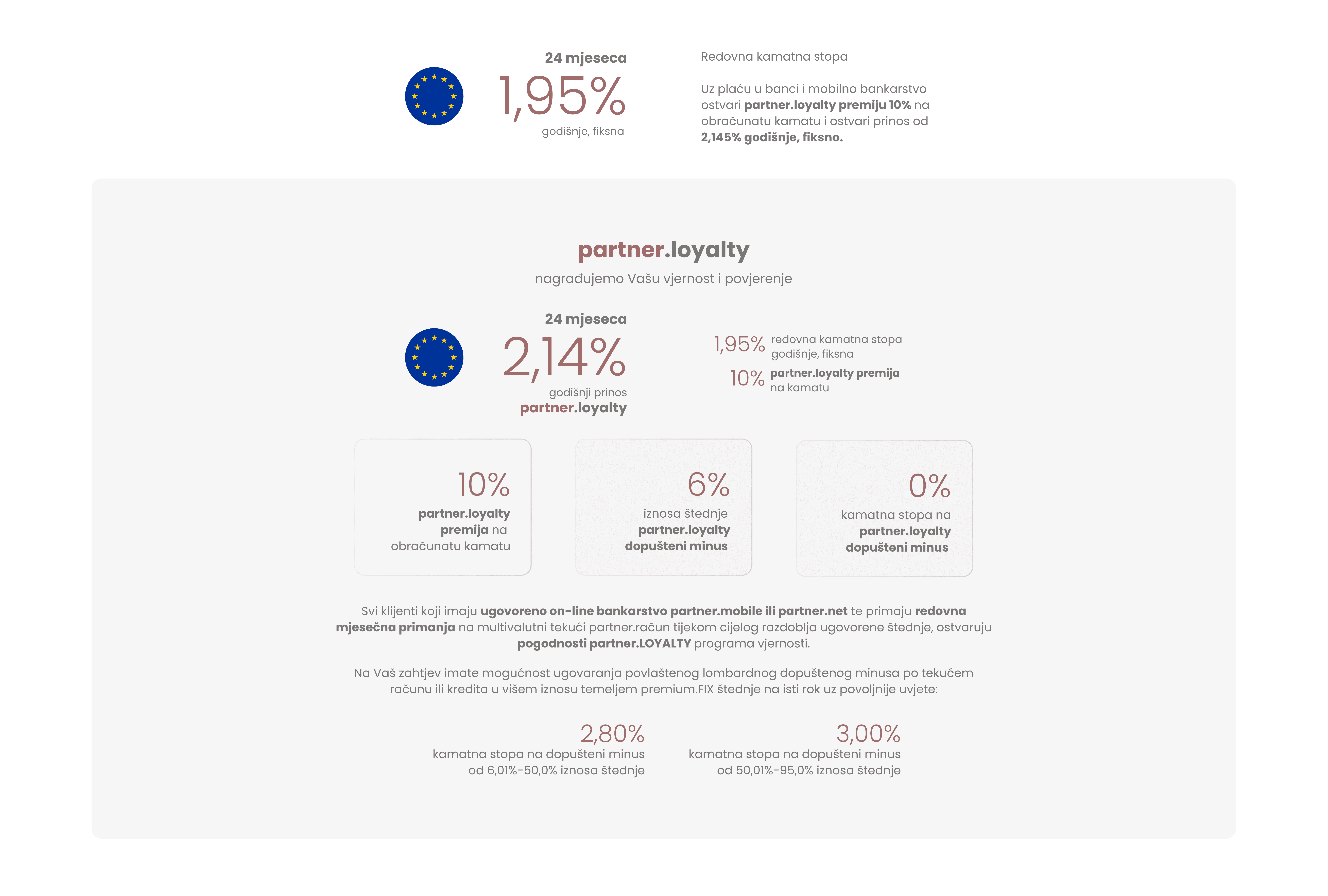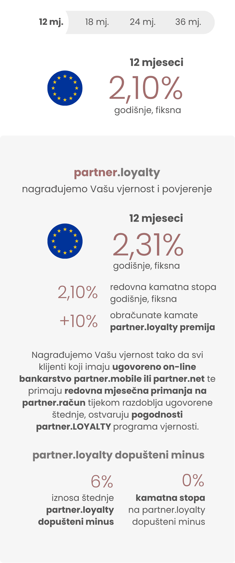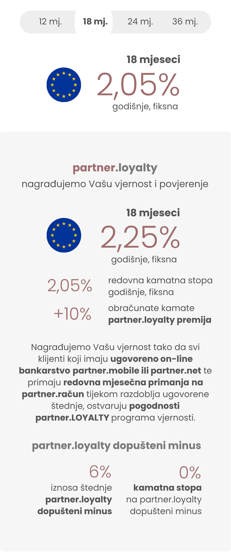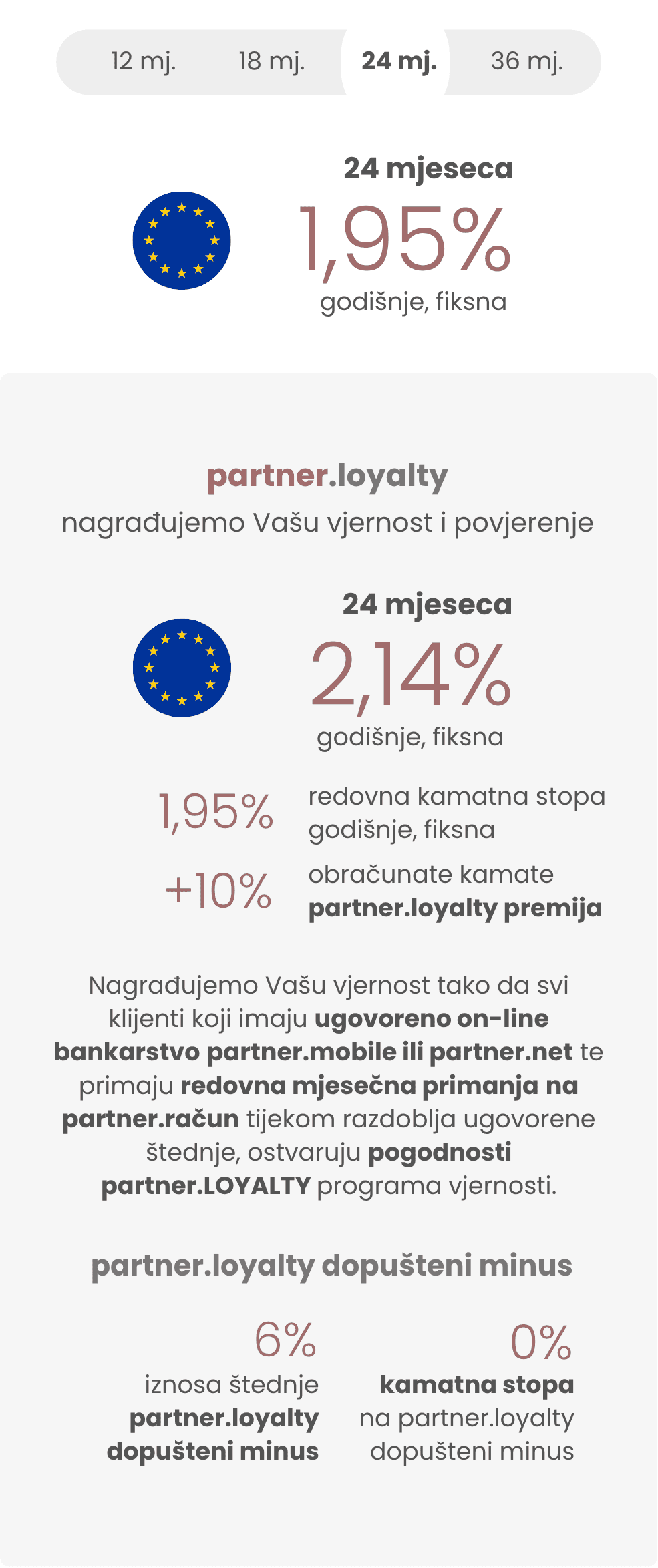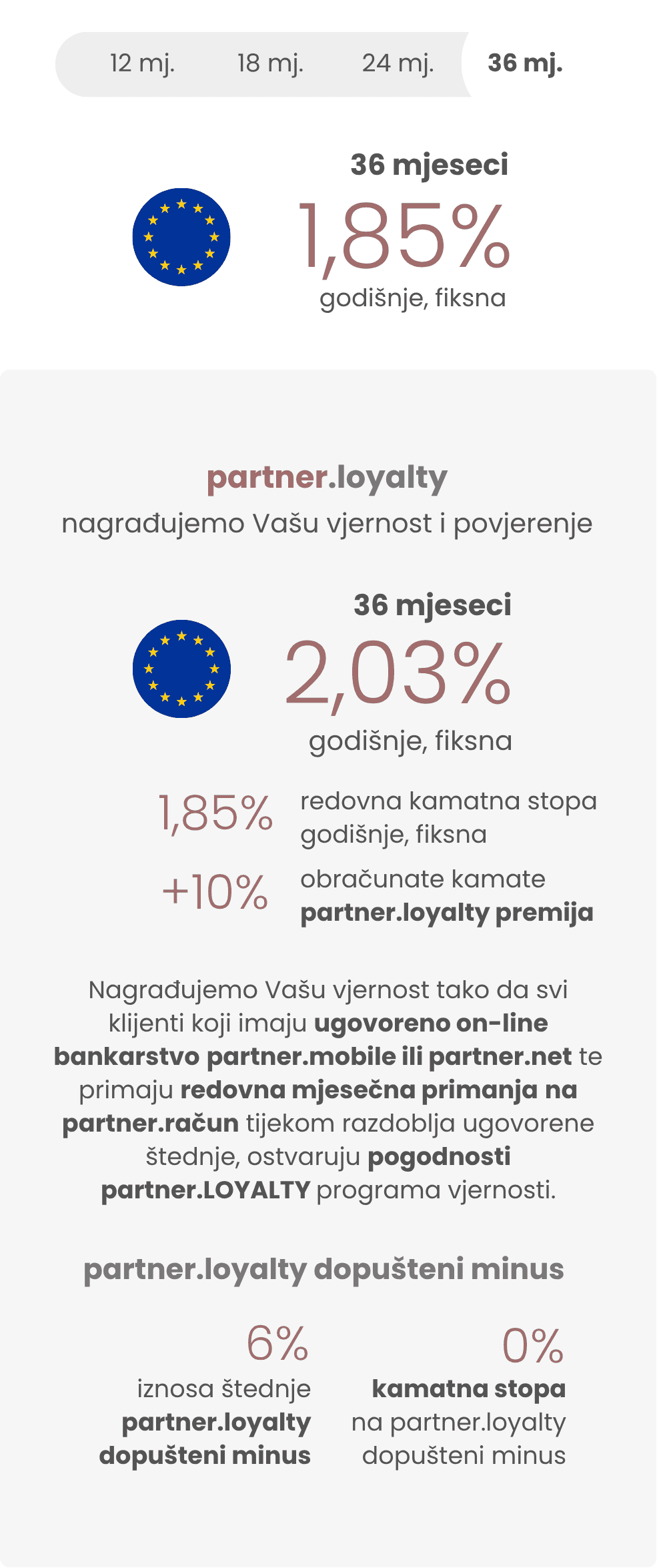 Ova štednja posebno je stimulativna za partner.LOYALTY klijente kod kojih nagrađujemo lojalnost te im omogućujemo i dodatnu premiju 10% na obračunatu kamatu i povlašteni dopušteni minus do 6% iznosa štednje bez kamata.